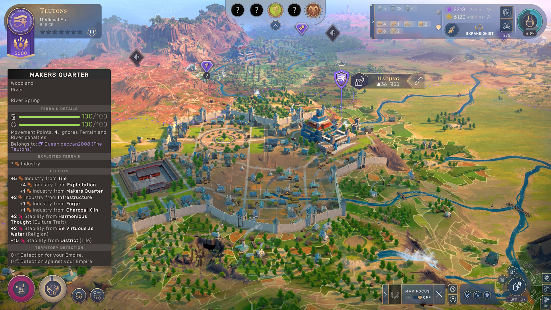 Another more subtle and yet very important difference is that you don’t need workers to exploit tiles. Anytime you build something on a hex, you instantly exploit it and all of its surrounding hexes. Add to the fact that you can expand a city by attaching neighboring territories to it, and you get the massively sprawling urbanization of the endgame. Doing this makes your city’s stability drop so you do need to build things that keep your people happy. This means that a city might have almost no population yet can have high industrial production which isn’t intuitive at all but that’s how these rules work. Constructing any unit at all does use population as a cost and that population is returned if you disband the unit within one of your own territories. You can even deliberately do this to transfer excess population from one city to another.
