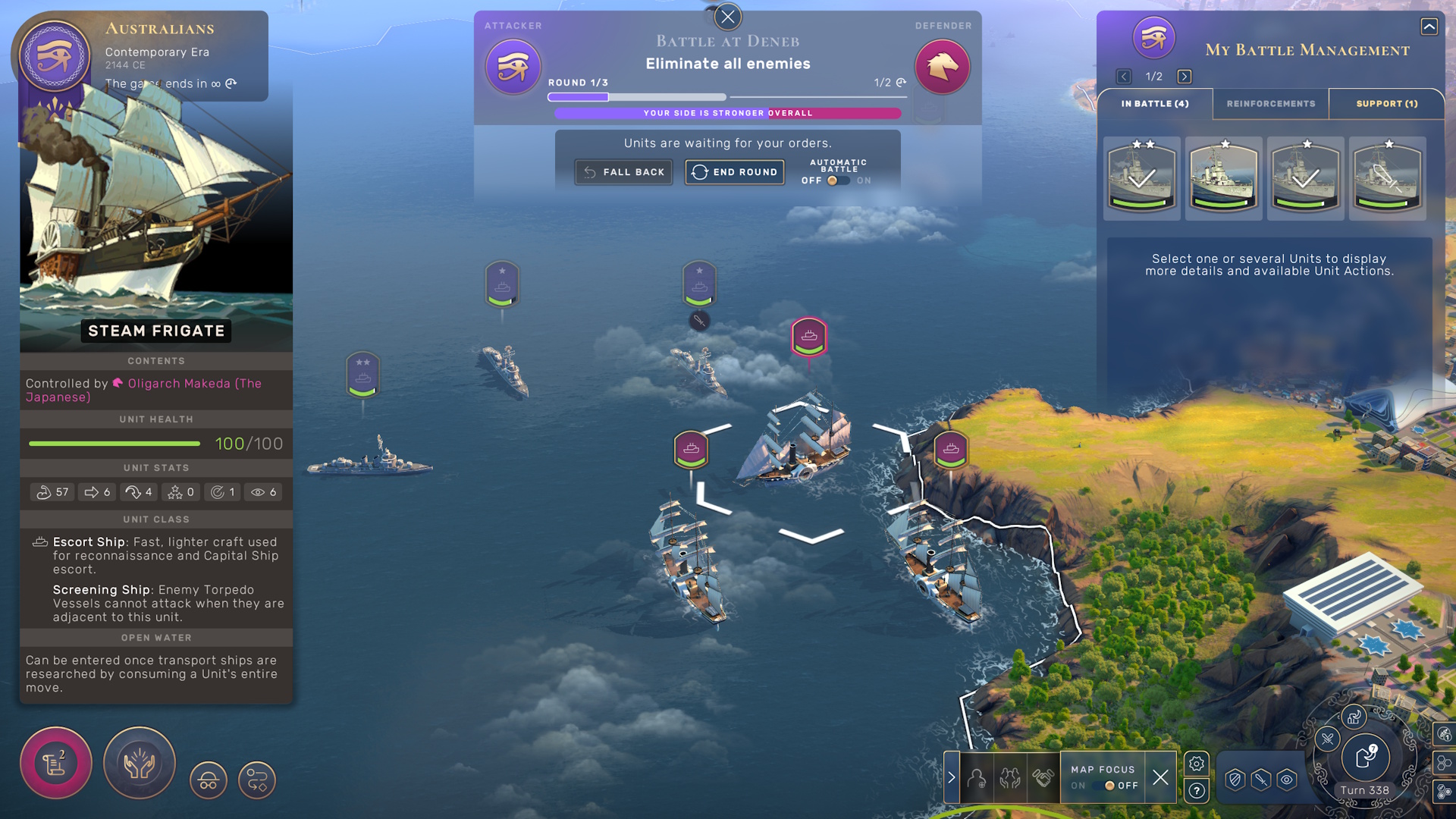 I don’t much care for how combat works either. The manual battle option puts you into a tactical view of the map so that you can control the individual units of your army. You can just opt for an instant resolution but the results are guaranteed to be far less favorable. The combat rules are the usual ones: take advantage of high ground, don’t stand in the river, focus fire on enemies etc. It’s nothing special but works well enough. The issue is that it slows down gameplay without adding much in the way of richness. In most cases, it’s obvious what the best move is and you just repeatedly do the same thing every battle. I suppose the benefit is that you can watch the animation of your battleships launching missiles at enemy carracks.