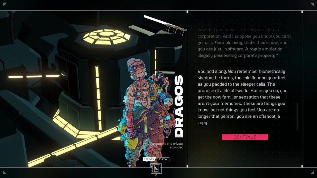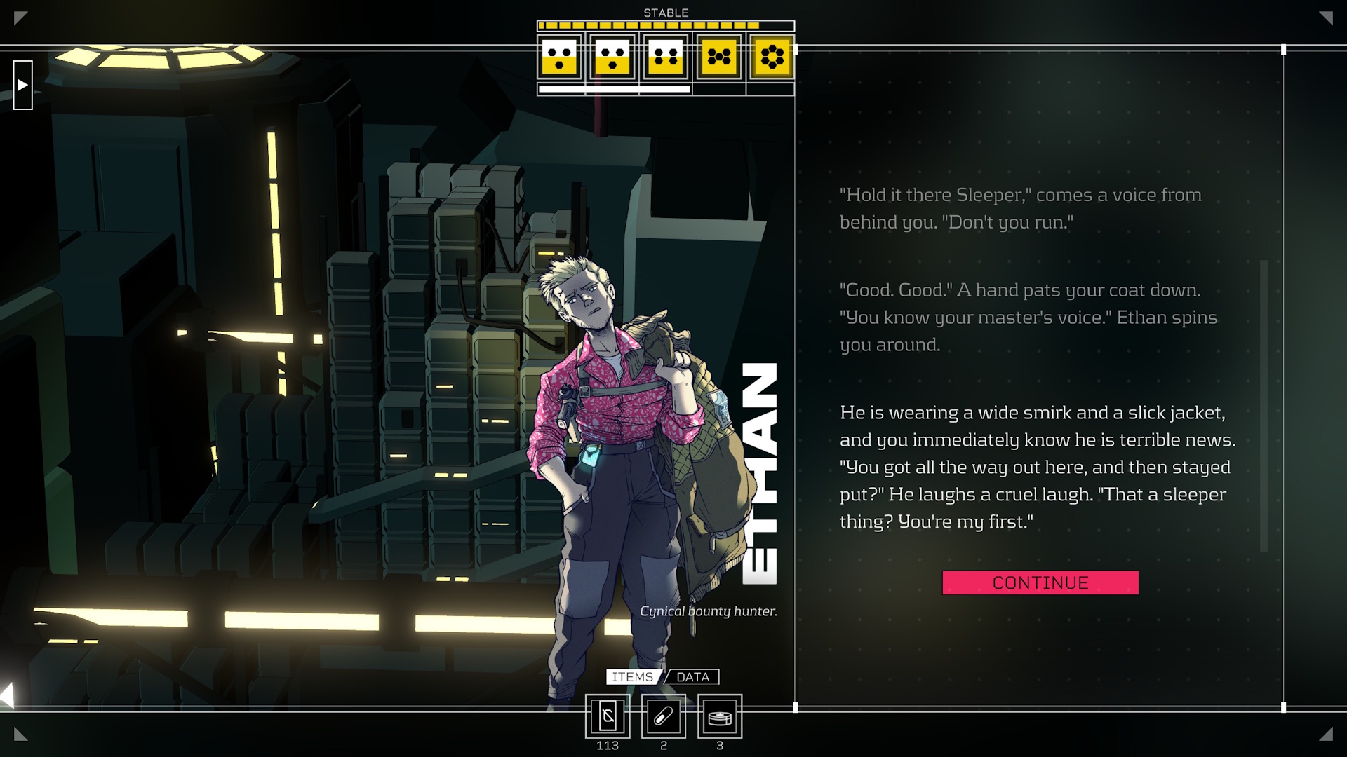 The player awakens as a Sleeper, someone whose real human body has been put into storage and the mind digitized and put into a synthetic body. You are the property of the Essen-Arp corporation, meant to be used as slave labor. But you have escaped aboard a freighter and made your way to the Eye, a crumbling space station inhabited by refugees, outlaws and other sleepers. Essen-Arp doesn’t let its property go easily however as your body is designed to break down without a regular dose of its proprietary stabilizing treatment. A kindly salvager offers you an empty shipping container and some work dissecting the hulls of old ships. With no resources and no friends, you’re forced to quickly learn how what passes for society works in the Eye. You must scramble for the Cryos that are used as currency here, find a way to repair your slowly decaying body and figure out what you want to do. Soon you must also contend with the hunter Essen-Arp has sent out to either retrieve or terminate their property.