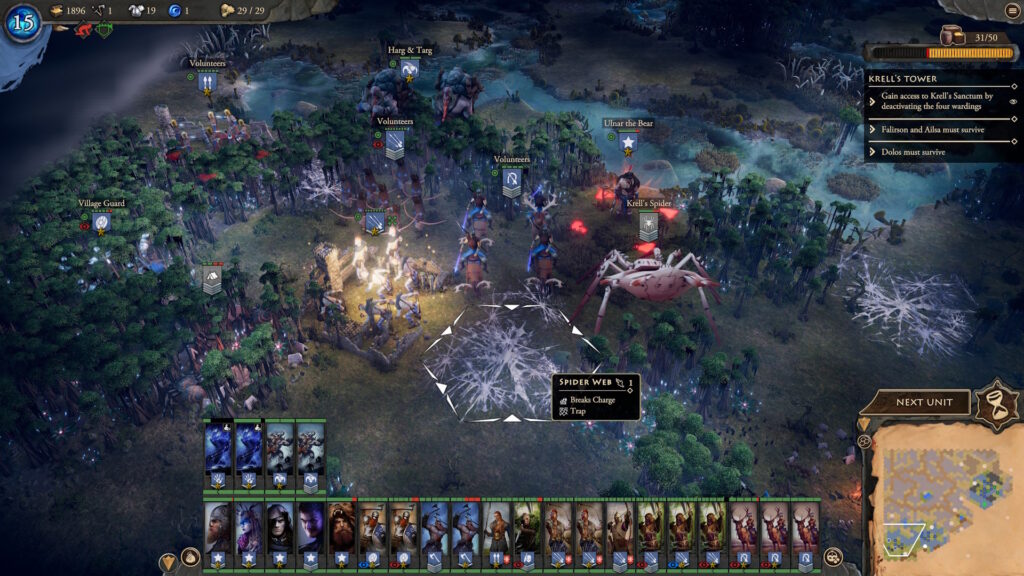 There’s no hard turn limit so you can theoretically take as much time as you need to beat a mission. But there is a wealth timer mechanic which give you bonus gold the more time you have left available. What’s more is that if it runs out entirely, you stop being able to gather resources from the map so you have a strong incentive to hurry. Every settlement on the map can be raided for gold and you are supposed to raid all the lizard hovels for the very rare liquid mana. In addition, there are many camps, caves, ruins and other places of interest on the maps to obtain resources from. It’s a little irritating to me as optimal play consists not only of beating the enemy forces present on the map and achieving your objectives but also of figuring how many extra units you can safely divert to hoovering up everything from the map. As these upgrades make a huge difference in power, you really do want as many resources as you can get.