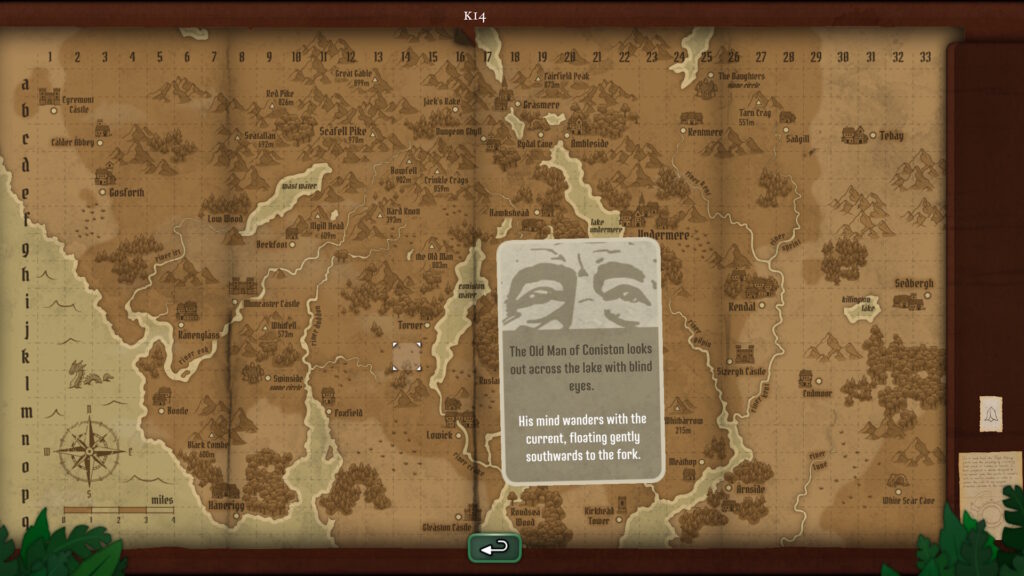 So the shopkeeper as aspect of the gameplay is immediately familiar and this time you neither have to guess what the customer wants nor to do any additional work to process the raw ingredients. The challenge is the plants in your collection don’t start out being labelled so it’s up to you to identify them. The guidebook contains an illustration of each plant, but it’s in monotone and may frequently depict only part of the whole plant. So you need to carefully read the accompanying description and examine the plant itself to get the right one. I’d expected that once you have identified a plant, you’d get customers asking for it again. That would be trivially easy but the game refrains from this sort of repetitive gameplay to its credit. In addition to this, you add plants to your shop mainly by venturing out into the world. This is done simply by choosing a location on the map to visit. The challenge then is deciding where to go based on the clues that you obtain either through the cards that are unlocked every day or from visitors. Sometimes the puzzle is as simple as visiting a location named by someone. Other times, you must carefully study the terrain features of the map to figure out where you’re meant to go.