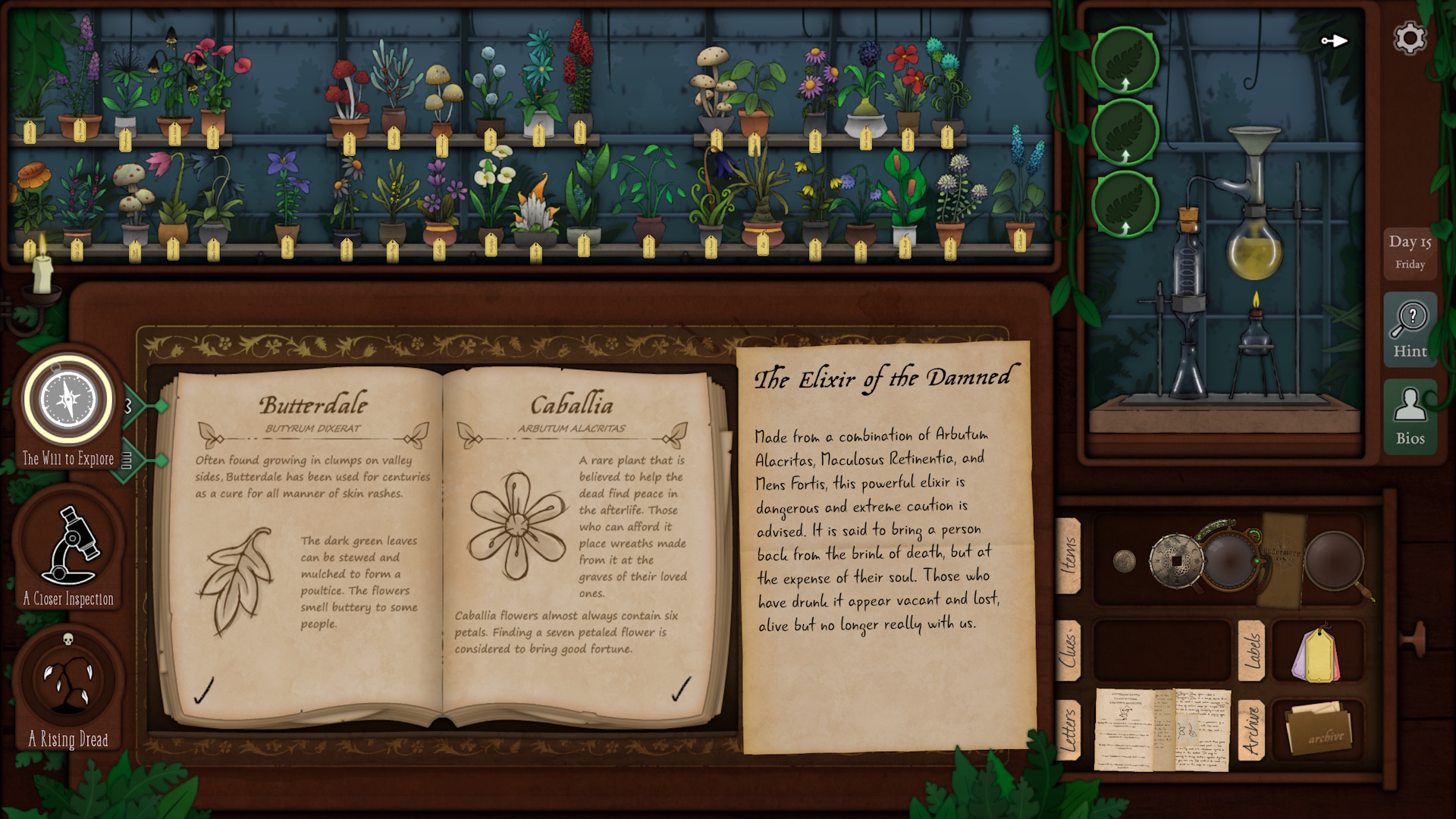The premise is that you have inherited a plant shop in the town of Undermere from a relative. Despite not having any knowledge of plants, you decide to continue operating the business with the assistance of a encyclopedia of sorts and the cryptic notes that are left behind. Every day, residents of the town will visit your shop to seek assistance with their problems. Usually they will want a herbal remedy for health issues, for good luck or to ward against pests. But some plants have mystical effects and may be dangerous. Everyday you will also receive information about new plant specimens to add to your collection and must decrypt the clues to go out into the world to collect them. As you serve customers, you become aware of the activities of a nature-worshipping sisterhood in the woods. They have unwisely summoned a powerful monster, leading to a spate of murders, and attracting the attention of a police investigator, cultists and others. By deciding which plants you offer to each of them, you can determine how the storyline unfolds.