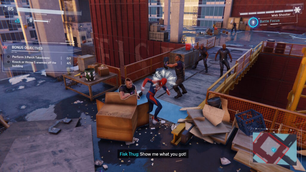 The combat system is obviously inspired by the Batman games, possibly too much so as you can even stealthily strike at enemies. Rack up a string of hits to generate Focus, spend it to instantly knock out enemies, deploy gadgets and so on. The difference is that Spider-Man can’t block attacks and so must rely on his superior mobility to dodge attacks. You must also be careful as you don’t have invulnerability while locked in an animation and attacks can and will come in from off-camera. The safest place is in the air so you’ll regularly launch enemies to beat them up and web swing in between them. Enemies with melee weapons or shields require special tactics and brutes need to be softened up by using gadgets or throwing an environmental object at them. The scripted boss fights against supervillains are much the same with the main difficulty being in figuring out what is expected of you. It’s fun, albeit somewhat repetitive as there are so many fights all across the map. I’d argue that it might even be a little too easy as Focus is an easy source of healing, especially once you unlock some Skills.