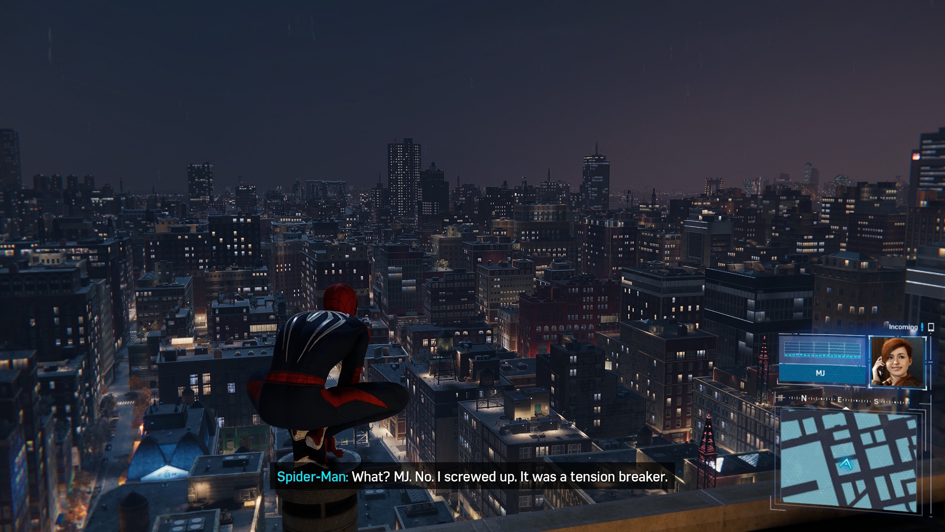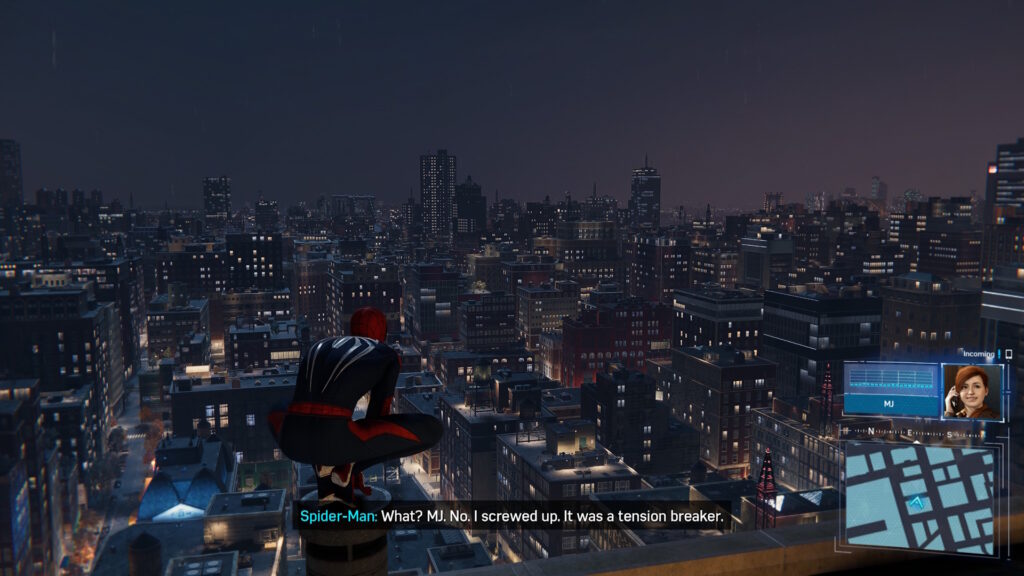 One frequent complaint is that some story segments force you to play as MJ or Miles. As they don’t have superpowers, you need to rely on stealth to get past obstacles. It’s never fun to get forcibly disempowered like that, the segments are short enough and easy enough that I wasn’t too annoyed. Plus they are a good way to deliver exposition to develop the story and break up the pace a little. There are plenty of optional activities and some side missions as always. Most of them are excuses to get into more fights. The most interesting challenges are about traversing across the city as fast as possible using all of the tools at Spider-Man’s disposal. I found them to be very difficult as the unique web-slinging mechanic makes it easy to cross distances quickly but hard to precisely place Spider-Man in a given location. Truly mastering web-slinging will take dedication that I don’t have but I can see how satisfying it can be.