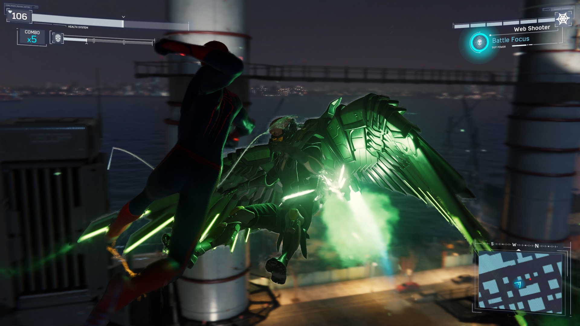 I only have a few minor complaints. The Harry Osborn’s Research Stations optional activity feels silly and out of place even if they introduce some new ways of playing. There seems to be a persistent visual glitch towards the end of cutscenes and I had to restart a couple of boss fights because some needed elements didn’t spawn in correctly. The main story is so good that I’d actually hoped it would go on a bit longer. Yet at the same time, I got thoroughly bored by the repetitiveness of the side-activities. Also, cool as the city is, it starts feeling samey after a while as you mainly experience it from the rooftop view. It’s a great stage for chasing villains around and for fighting but feels lifeless otherwise.